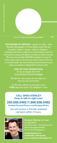 “Sometimes we are asked as brokers to create income from reverse mortgage proceeds. One way is with an Income Advantage produce (that creates a better cash-flow solution). We greatly benefited not only a beautiful lady in her late 70’s with moderately advanced Alzheimer’s but also helped her lift a burden off of her children. Her short-term memory was about 30 minutes; long-term memory was perfect. She was still living in the home she had raised her daughters in. Doctors encouraged the family to keep her in the home versus moving to a care facility and totally disrupting her life. Her two daughters had taken long-term leaves of absence from work to care for mom because there were no investments left, and this was beginning to take a toll on their lives. Their credit union couldn’t qualify the mother for any mortgage or line of credit because of limited income (OAS & CPP only) but suggested the daughters (joint Power of attorney) ask about reverse mortgages. We can arrange for a ‘income advantage’ program that creates an income. We did. The children are receiving $ 6500 per month to pay for full-time in-home care; the home was appraised high enough that, even with a very low loan-to-value, this cash-flow will last 10 years before reaching the authorized limit (40% of the home value).” And in 10 years time, Gregory Stanley will request a new appraisal to see how much real estate values have risen (as they usually do over a 10 year period) and have the loan ‘reset’ to the higher home value; this may allow for more funds available to adjust for future planning needs. Once you use mortgage broker Gregory Stanley he will always be there to help you.